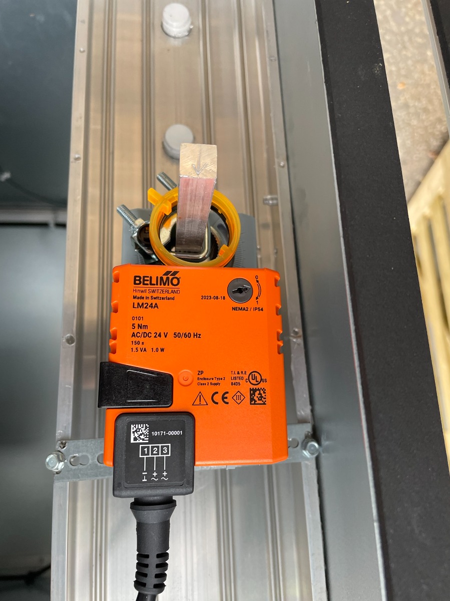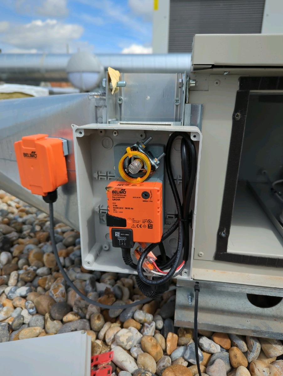 This is for a small Heat Recovery Unit commissioning we did back in April 2024. Similar process to the commissioning we displayed above. One key component was different in the fact that this actuator was installed with an enclosure to weatherproof it from poor weather conditions that may affect its functionality and inevitably damage the product. Due to it being the standard LM24A which comes IP54 rated, you have to build it in a small enclosure when the AHU units are outside. An alternative Belimo solution would be the IP66 versions which come with an already built in enclosure such as the NM24P.